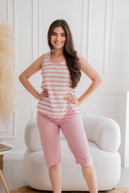 Nuestras pijamas Capri para dama están confeccionadas en lanilla doble punto, también conocida como polialgodón, un textil semi-licrado, fresco y suave. Diseñadas para brindar comodidad en cada momento, estas pijamas son ideales para disfrutar del descanso con estilo y frescura. ¡Perfectas para cualquier temporada!